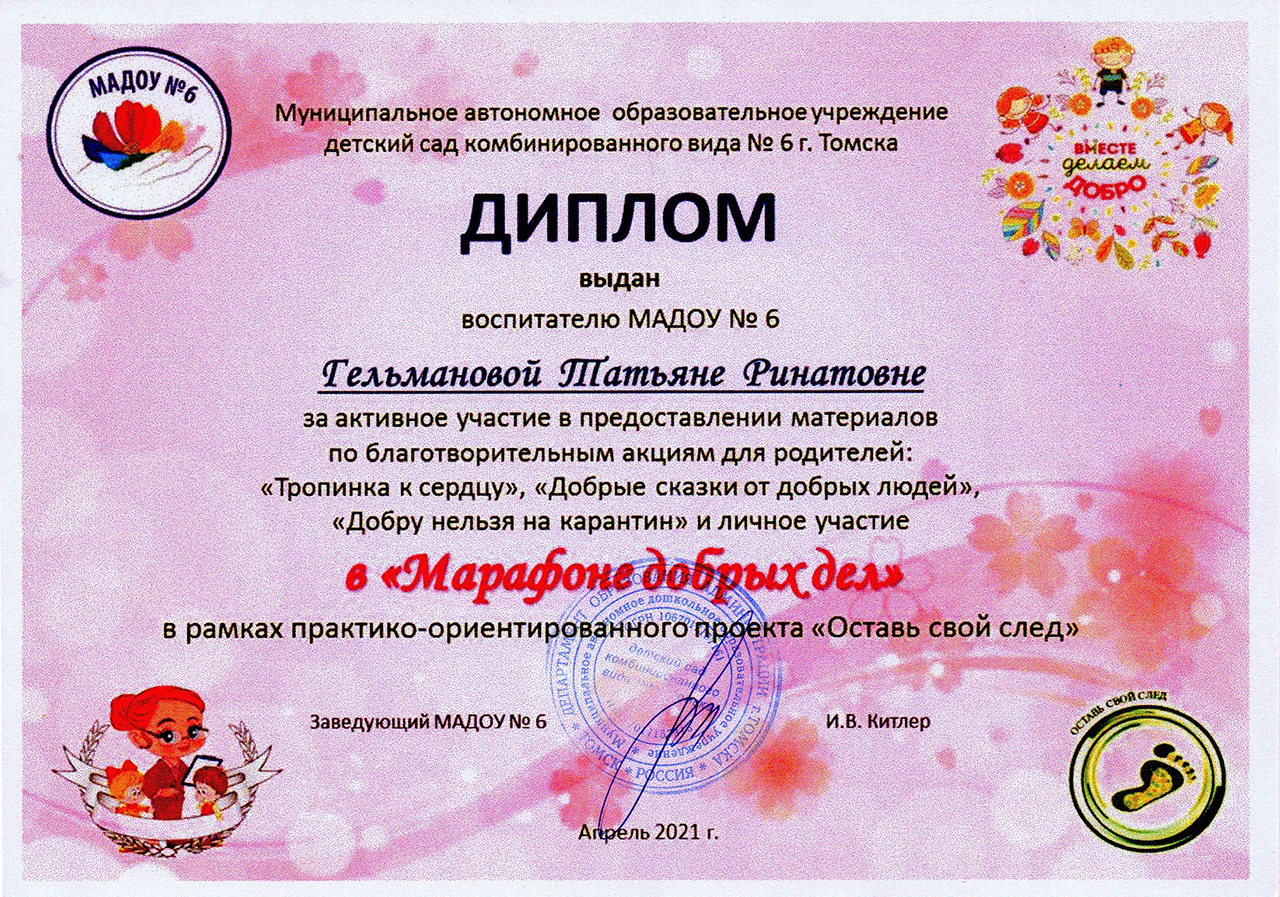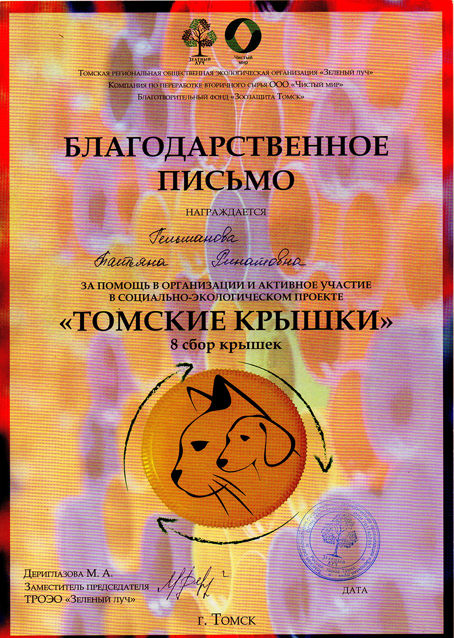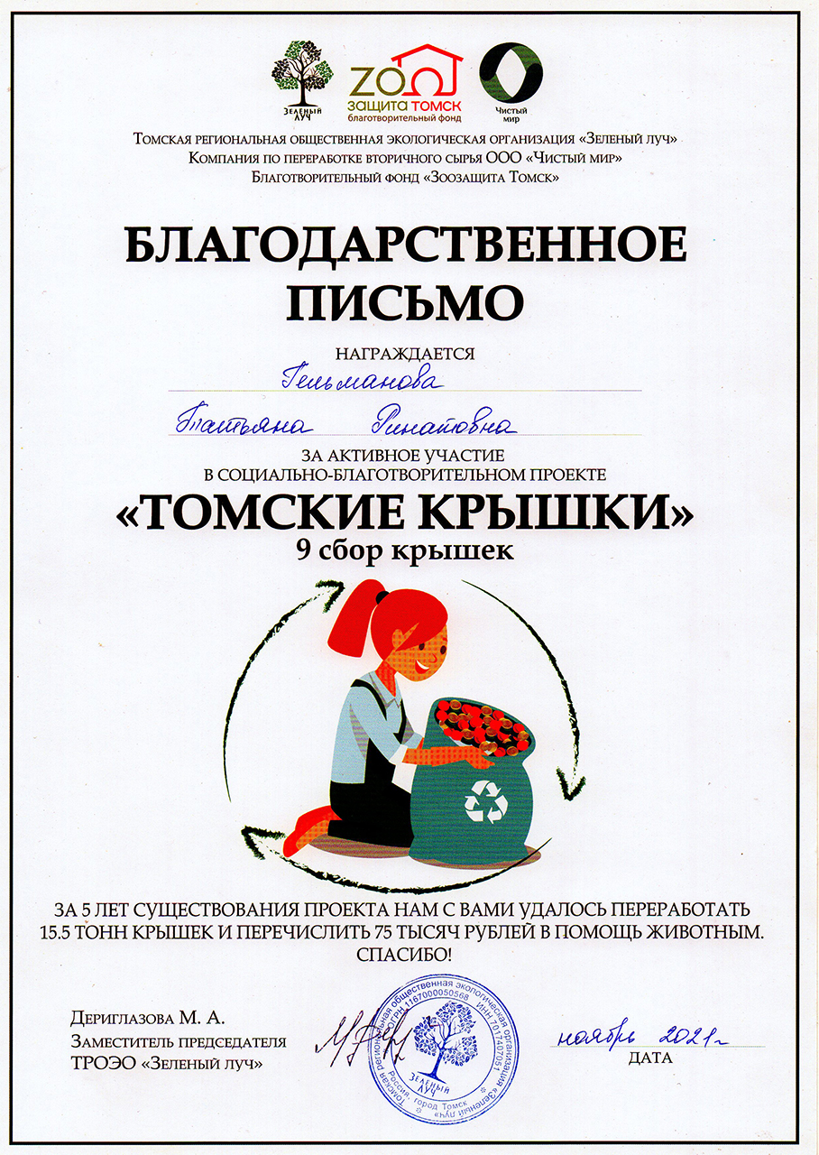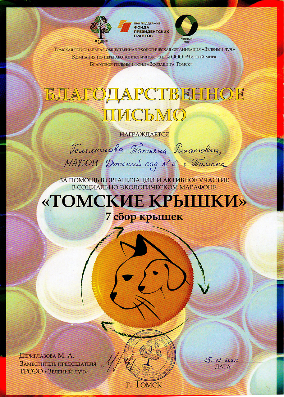 - в социально-экологическом марафоне «Томские крышки», организаторами которого являются ТРОЭО «Зелёный луч», компания по переработке вторичного сырья ООО «Чистый мир», БФ «Зоозащита Томск» (родители и дети активно собирали крышки и сдавали их на переработку. Вырученные средства были направлены в благотворительный фонд «Зоозащита Томск);