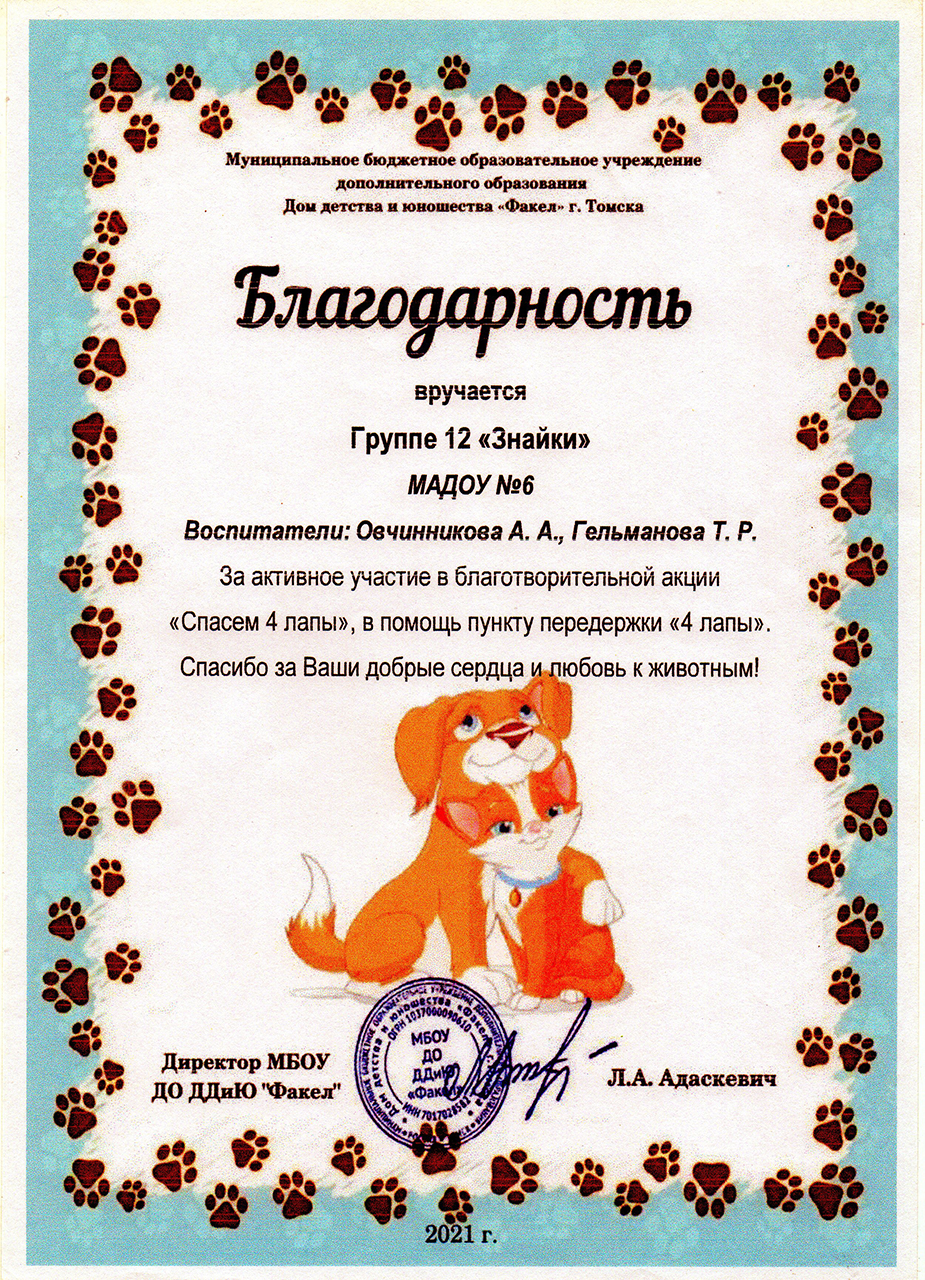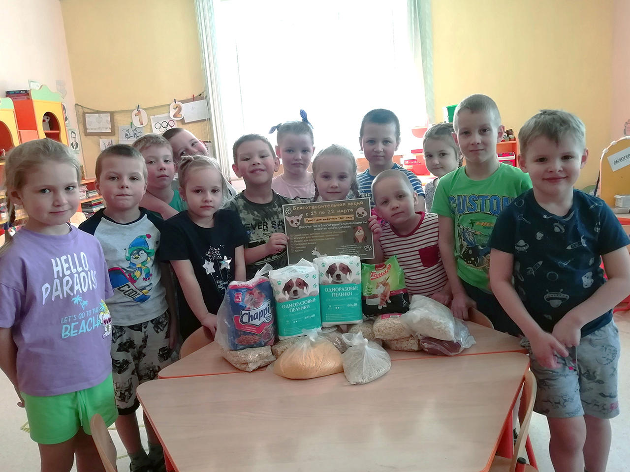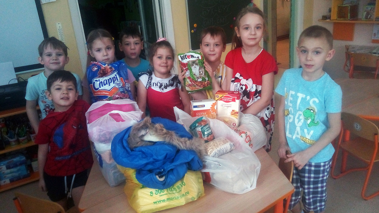 - в акции «Спасём 4 лапы» (в целях оказания помощи пункту передержки бездомных животных, в котором случился пожар, родители и их дети приносили крупы для животных, сухой корм, пеленки, подстилки, медицинские и хозяйственные принадлежности);